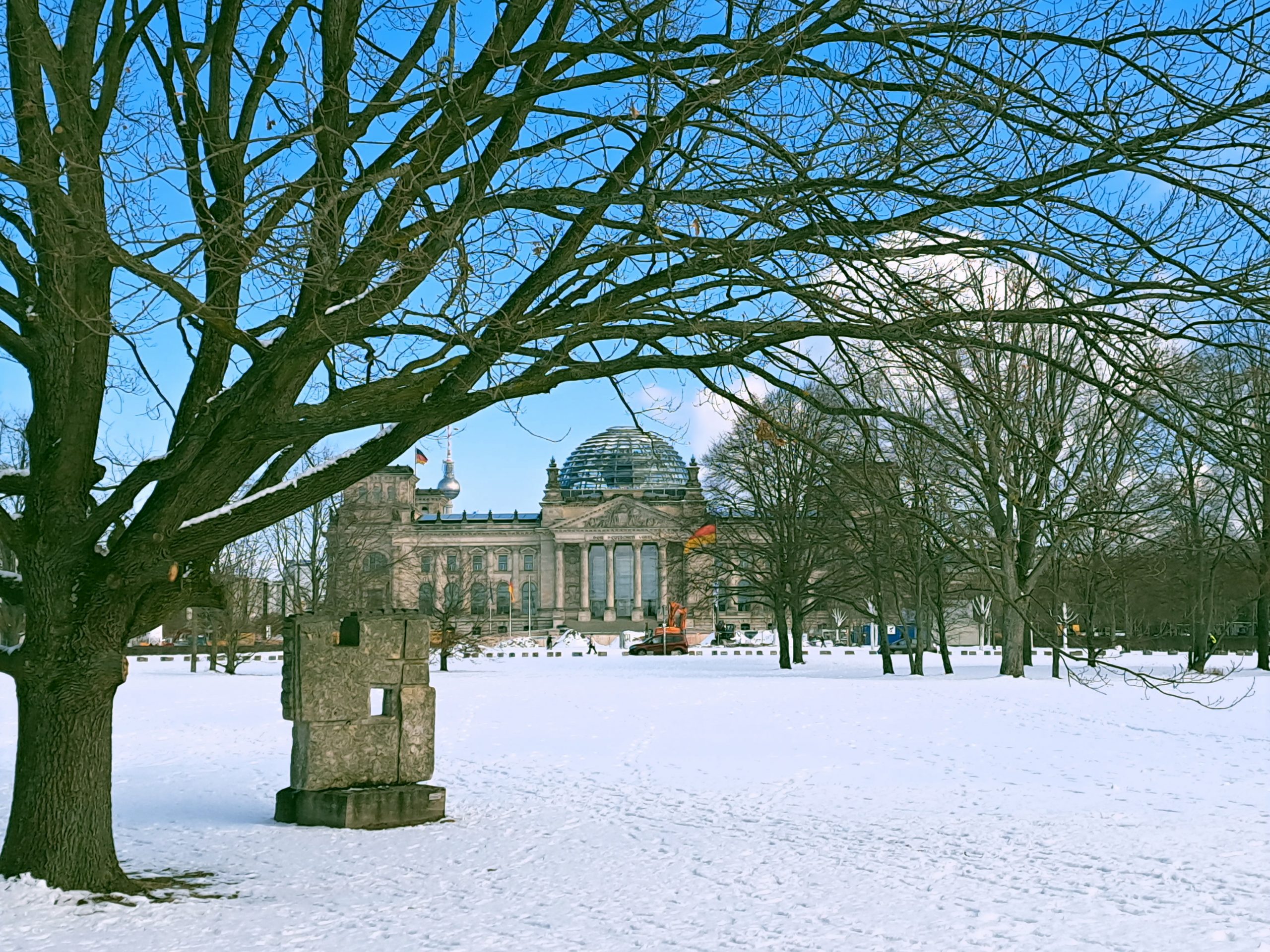 Am Ort der ehemaligen Kroll-Oper, direkt gegenüber des Reichstags, wo Adolf Hitler 1939 den Zweiten Weltkrieg und damit auch den Angriff auf Polen erklärte, errichten wir derzeit im Auftrag des Deutschen Polen-Instituts ein, zunächst vorläufiges, Denkmal für die polnischen Opfer der deutschen Besatzung. Am 16. April 2025 war ein besonders spannender Tag des Projekts: Mithilfe eines 500 t Krans wurden ein Findling von ca. 30 t und ein wunderschöner Wildapfelbaum an den Gedenkort gesetzt. Der Findling wird den Mittelpunkt der vorläufigen Gedenkstätte bilden. Künftig soll dort noch das Deutsch-Polnische Haus für Begegnungen und kulturellen Austausch entstehen.